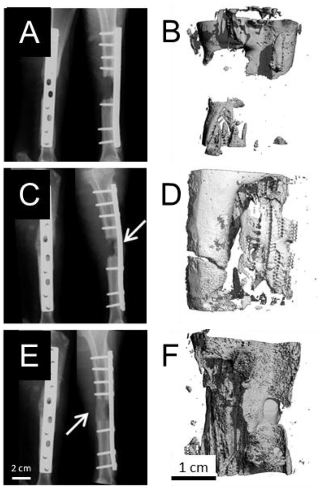 The micro CT analysis provided quantitative support for the qualitative conclusions drawn from the clinical X-rays. It support the X-ray result that just one of the five GF-free defects showed defect bridging in contrast to 7 of the 10 GF treated defects (4 of the BMP-2 treated defects, 3 of the combination GF treated defects).