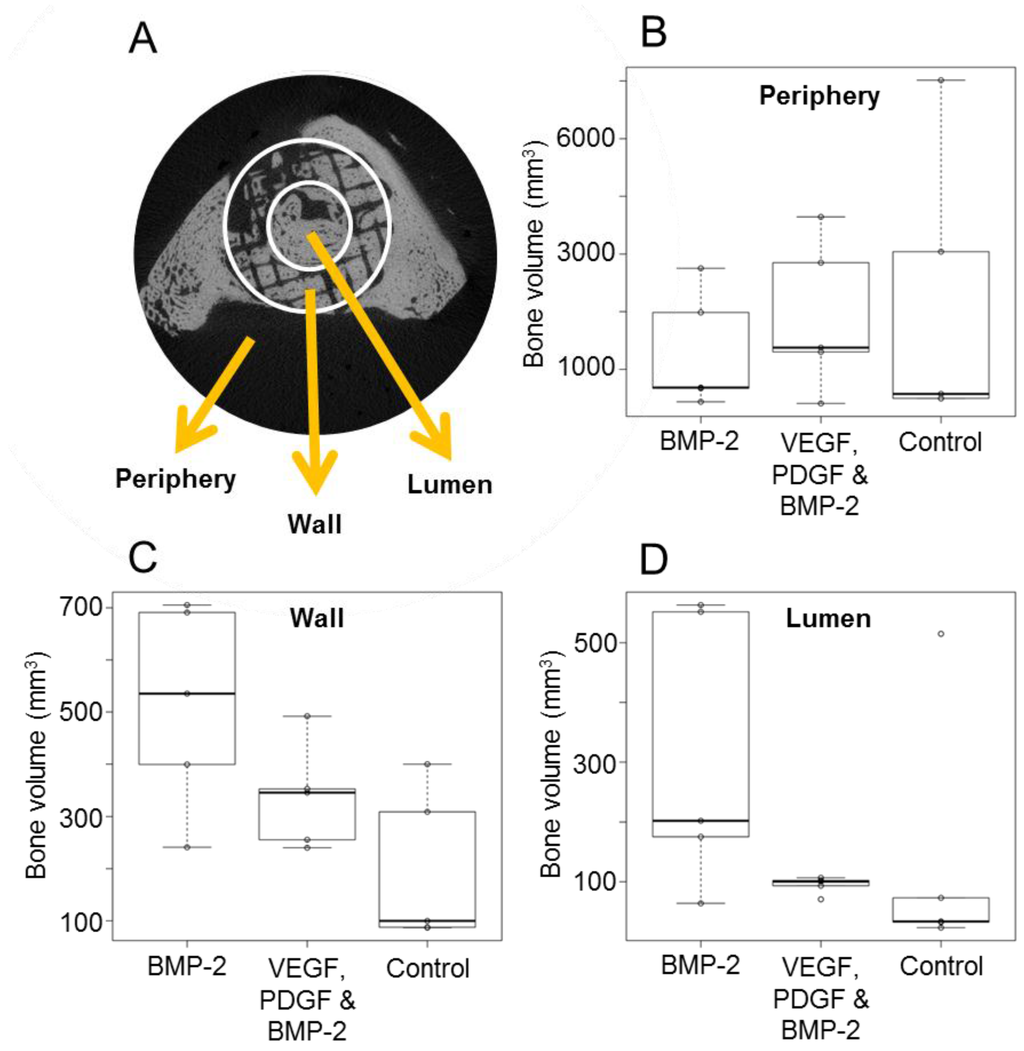 Bone volumes within different defect regions (A) were quantified; bone volumes within the periphery (B); scaffold wall (C); and scaffold lumen (D) for each experimental group are shown.