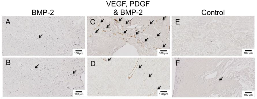 Several antibodies were selected to evaluate the newly formed bone tissue and identify any differences between groups. Von Willebrand Factor (vWF) is a blood glycoprotein involved in hemostasis and by identifying regions of vWF using immunohistochemistry (IHC), we were able to identify blood vessels within the defect/scaffold. The mid-region (sectioned laterally) indicated a difference between groups. In the GF-free and BMP-2 only groups, very few blood vessels could be identified, whereas the VEGF, PDGF and BMP-2 group had a higher density of blood vessels, both large and small (Figure 7).
