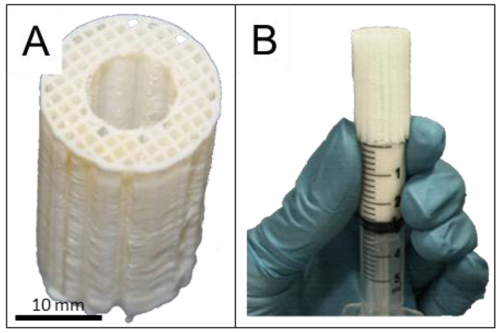 Microparticles were incorporated into a polycaprolactone scaffold which is designed with large pores (>500 micrometers) and fully interconnected honey comb pore architecture (A); the microparticle/platelet rich plasma mixture was injected into the scaffold from one end (B).
