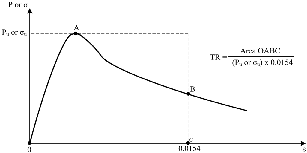 Toughness can be defined by the area under the stress-strain curve or load-strain curve [6], and the toughness ratio is defined as the ratio of the toughness of a concrete specimen to the toughness of the rigid material [6], as given in Figure 1. Fanella and Naaman [19] reported that the compression tests on fiber mortar cylinders were not continued beyond a strain of about 0.0154, in which the specimens still had residual strengths; the toughness of the specimen was calculated up to a strain of 0.0154 and thus led to lower bound estimate of the toughness. In this study, the ultimate strain used in calculating toughness is 0.0154, and Equation (1) is given to compute toughness ratio TR.