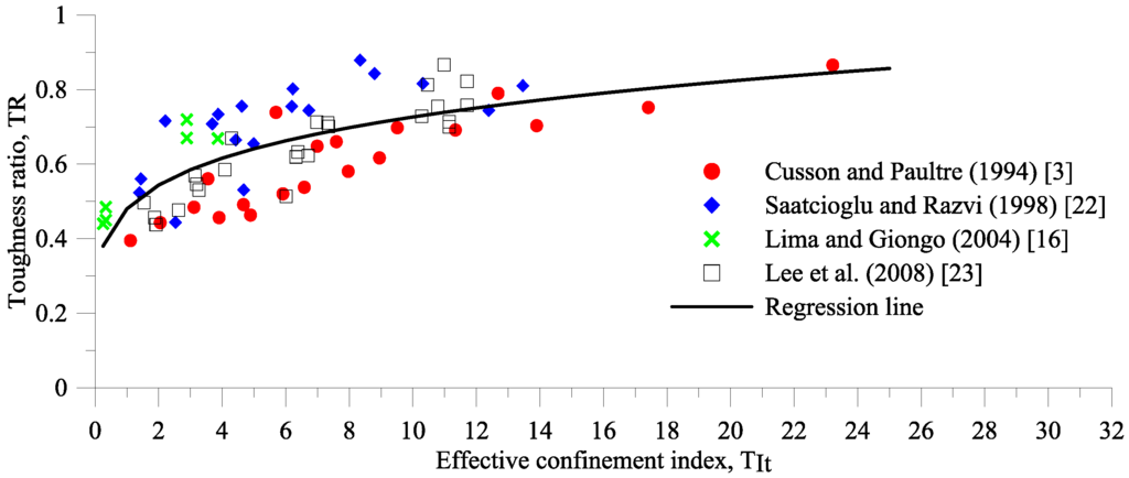 The TR prediction equation [(Equation (2)] for HSC confined by transverse reinforcement is expressed in term of effective confinement index, TIt, and was derived by regressing 69 experimental results obtained from compression tests on HSC columns with high strength transverse reinforcements [3,16,22,23], as shown in Figure 3. The concrete compressive strengths and the transverse reinforcement yield strengths range from 53 to 124 MPa and 392 to 1000 MPa, respectively.