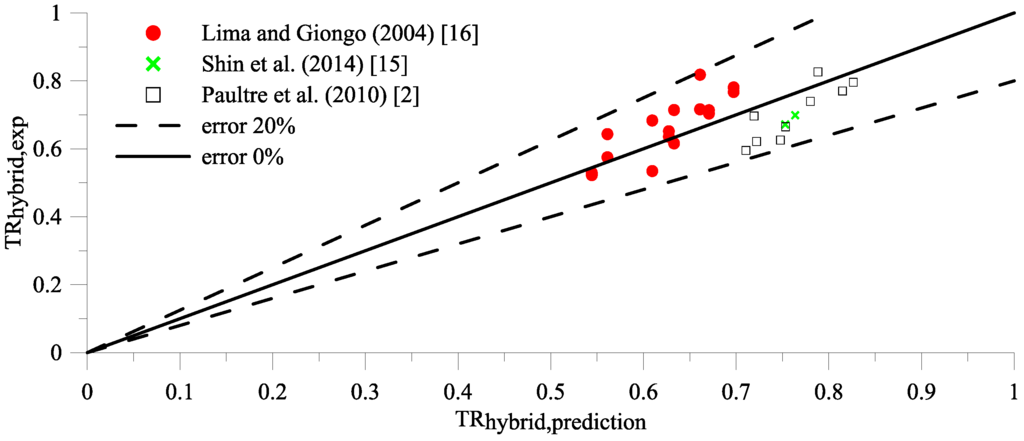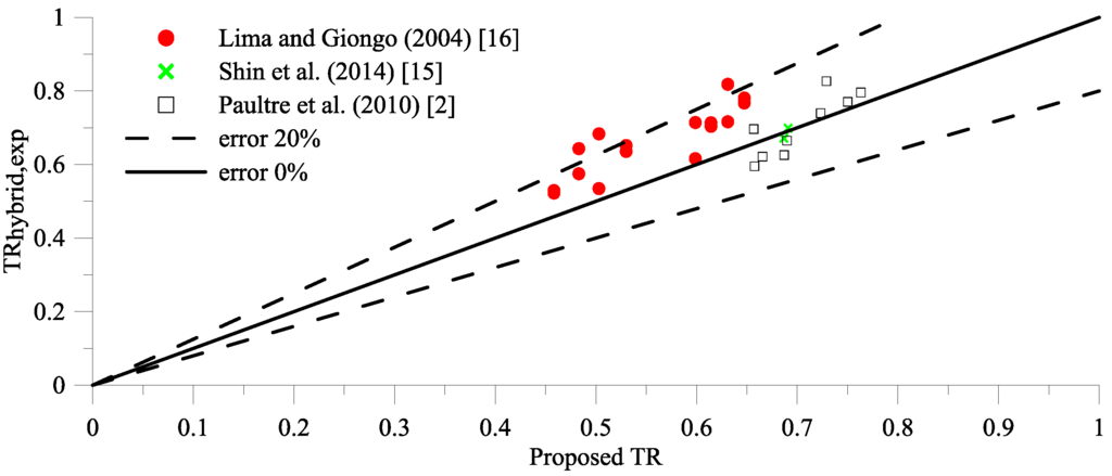Substituting Equation (6) into proposed TRHSC,prediction [Equation (2)] to calculate TRhybrid,prediction, however, tends to produce errors between proposed TRhybrid,prediction and TRhybrid,exp larger than 20%, as illustrated in Figure 4. In order to minimize errors (Figure 4), TRhybrid,prediction will be expressed in terms of effective confinement index, TIt, and fiber factor, , as given in Equation (9).