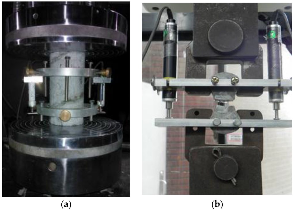 The concrete cylinders were tested on a servo-hydraulic closed-hoop testing machine with a capacity of 1000 kN which applied a monotonically increasing displacement loading at a constant rate of 0.01 mm/s. Two LVDTs (Linear Variable Displacement Transducers) provided on both sides of each concrete recorded the concrete axial strains, as shown in Figure 9a. The compression tests on concrete cylinders were conducted when testing the corresponding column specimens. A servo-hydraulic closed-loop testing machine with capacity of 30 kN and displacement rate of 0.01 mm/s was employed to conduct the fiber pullout tests. In order to measure the fiber pullout slip, two LVDTs were arranged to obtain the complete fiber pullout load and slip curves as shown in Figure 9b.
