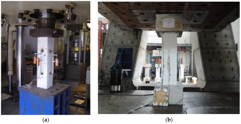 All columns were subjected to concentric axial compression load. The compression tests on all series of small scale columns were conducted under a servo-hydraulic closed-hoop testing machine with a capacity of 5000 kN, where the displacement rate of the machine was 0.0375 mm/s. For the measurement of the steel strain, two electrical strain gauges were laid on one longitudinal steel bar, and there were three strain gauges on one transverse bar (close hoop). These strain gauges were located around the mid-height of column. Four LVDTs with a gauge length of 400 mm recorded the axial strains, and were located at side of and at the mid-height of each column specimen. The large-scale columns were tested in the National Center Research for Earthquake Engineering (NCREE) Taiwan, by using the Multi-axial Resting System (MATS). At least, three electrical strain gauges on one longitudinal steel bar and transverse bars (one on the close hoop bar and two on ties) were available to measure the steel strains in the concrete, and were located around the mid-height of the column. MATS can apply a maximum axial load of 60 MN, and the loading rate employed was 0.05 mm/s. Figure 10 shows the test setup for a small-scale and large scale column.