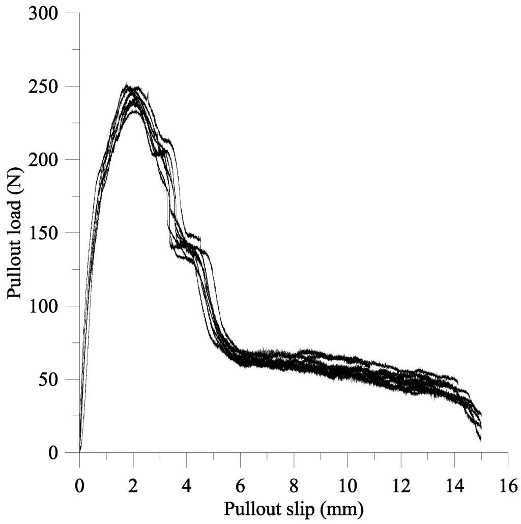 Figure 13 shows the pullout load-slip curves obtained from fiber pullout tests, and the area under the pullout load-slip curve shows the pullout energy Epullout. The equivalent bond strength, τeq, can be defined from Equation (13) [26].