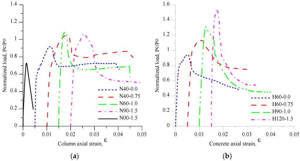 The specimens H90-1.0 and H120-1.5 were low-confined specimens, because the concrete cover of these two specimens did not show more cracks at the failure stage. Furthermore, the post-peak loads on the descending branch up to a strain of 0.03 of specimens H90-1.0 and H120-1.5 were much lower than those of specimens N40-0.0, N40-0.75, H60-0.0, and H60-0.75. The specimens N60-1.0 and N90-1.5 can be categorized as moderate-confined specimens. As seen in Figure 14, the post-peak loads on the descending branch of specimen N60-1.0 tended to approach constant value up to a strain 0.03 and were greater than those of specimen N90-1.5, H90-1.0, H120-1.5. For specimen N90-1.5, the post-peak behavior was more ductile than the post-peak behavior of specimen H90-1.0 and H120-1.5.