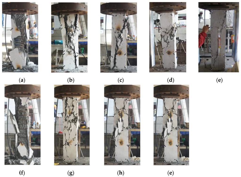 The final appearance of large-scale columns after testing: (a) S80-0.0; (b) S80-0.75; (c) S120-0.0; (d) S120-1.0; (e) S170-0.0; (f) S170-1.5; (g) S340-0.0; (h) S340-1.5.