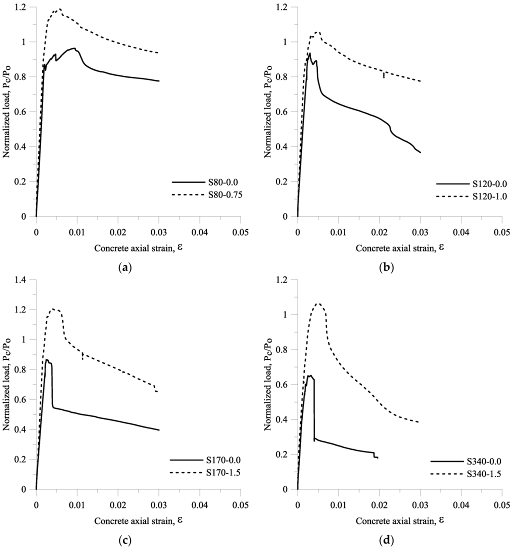 The normalized load Pc/Po vs. concrete axial strain curve ε for large-scale column specimens: (a) S80-0.0 and S80-0.75; (b) S120-0.0 and S120-1.0; (c) S170-0.0 and S170-1.5; (d) S340-0.0 and S340-1.5.