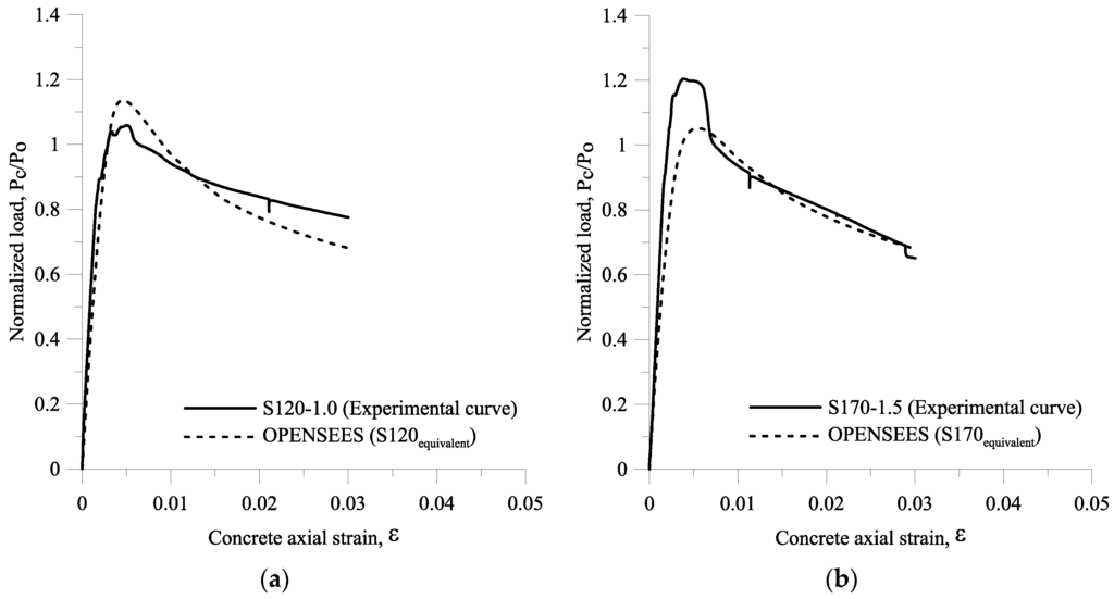 Comparison between the normalized load Pc/Po–axial strain from experimental curves and the normalized load Pc/Po–axial strain from the numerical model for large scale columns for: (a) S120-1.0; (b) S170-1.5.