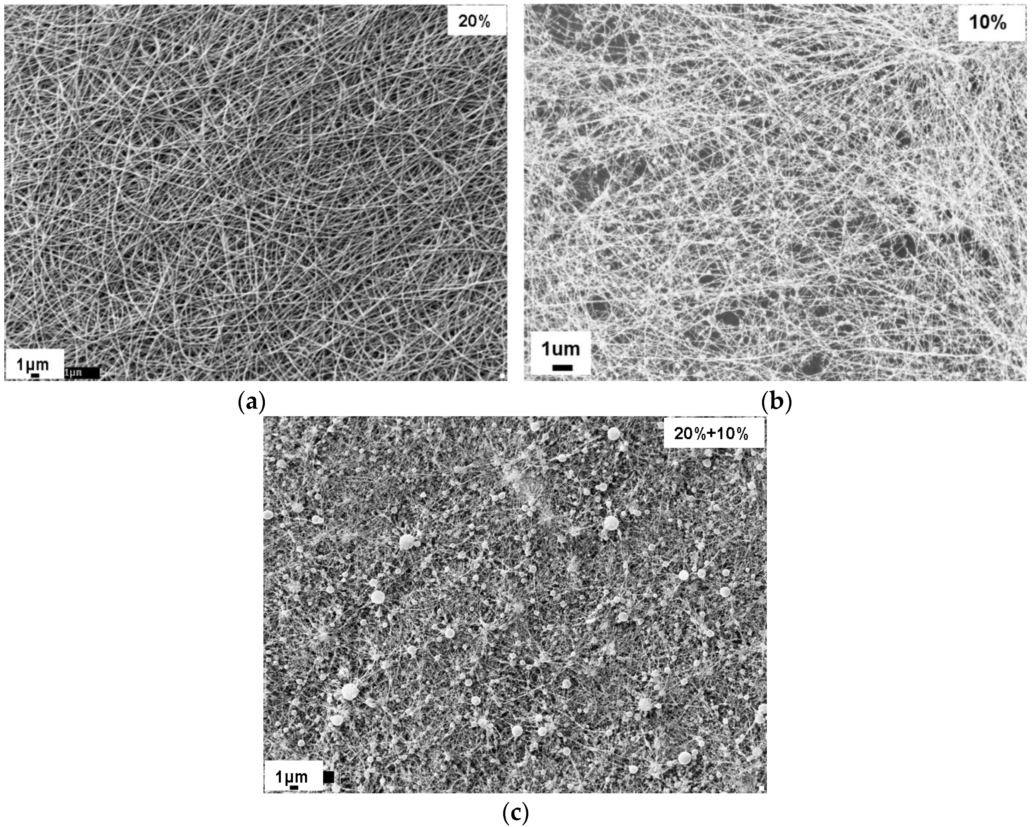 SEM imaging of nylon 6 nanofibers electrospun from (a) 20 wt % nylon 6; (b) 10 wt % nylon 6; and (c) 20 wt % and 10 wt % in 88% formic acid solutions.