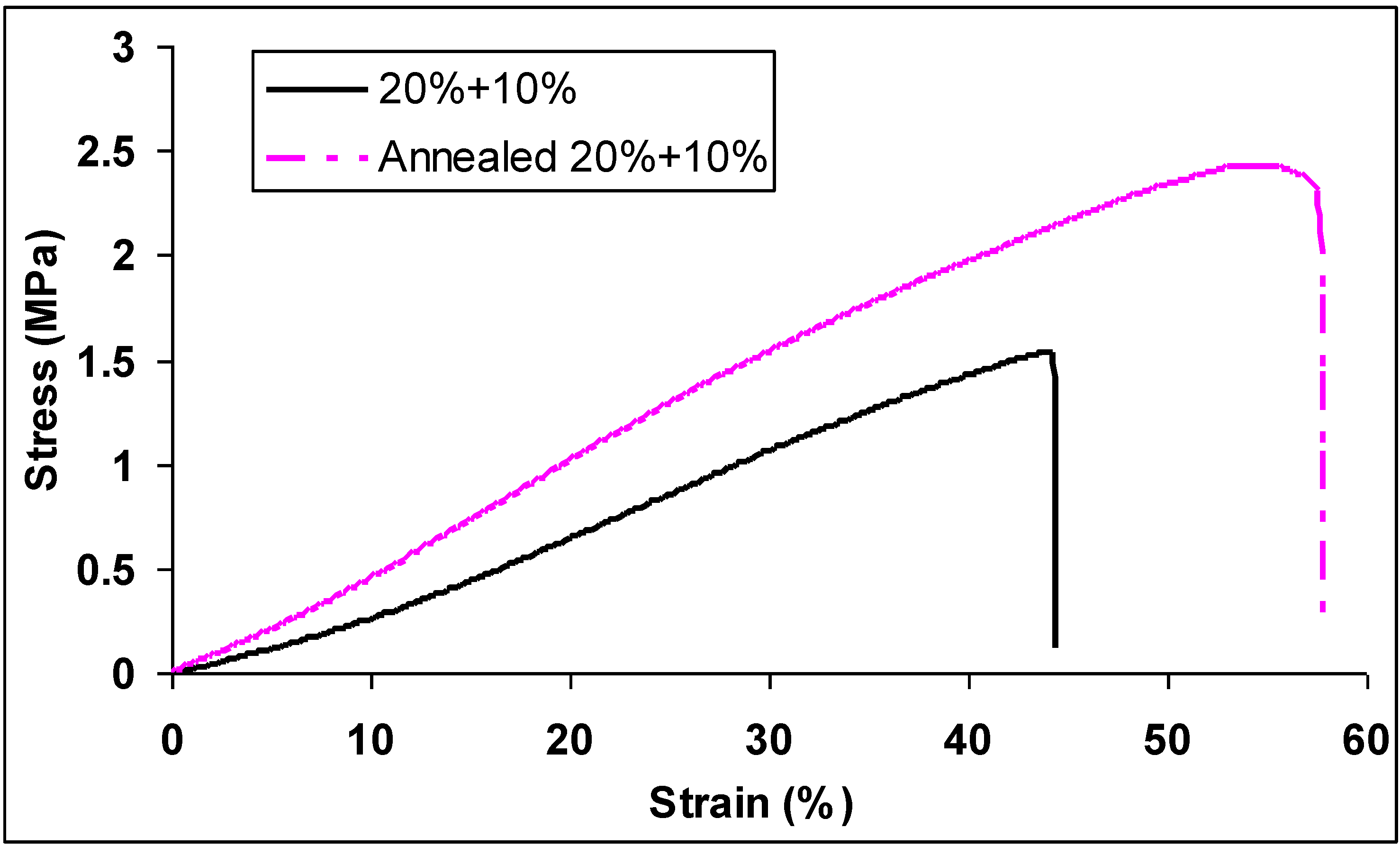 Figure 4 shows the typical stress-strain plots of nylon 6 non-woven fiber mats electrospun from 20 wt % and 10 wt % solutions. After annealing, tensile strength, elongation, and toughness of the nylon 6 non-woven fiber mats electrospun from 20 wt % and 10 wt % solutions increased 26%, 28%, and 68% compared with those from 20 wt % solutions. Young’s modulus, tensile strength, elongation, and toughness of nylon 6 non-woven fiber mats electrospun from 20 wt % and 10 wt % solutions before and after annealing are summarized in Table 2. For random-laid non-woven fiber mats, once the web is formed, the fibers must be bonded together to stabilize the web and allow it to exhibit the desired mechanical properties. Both individual fiber mechanical properties and cohesion between fibers can be improved by free and constrained annealing of the electrospun non-woven fiber mats at temperatures slightly greater than the base polymer’s glass transition temperature. The annealing process reduced internal stresses (decrease shrinkage) and increased crystallinity and crystalline alignment within fibers. Choi et al. [22] reported that the physical properties of the electrospun poly(etherimide) (PEI) fiber web were improved by thermal treatment above its glass transition temperature.
