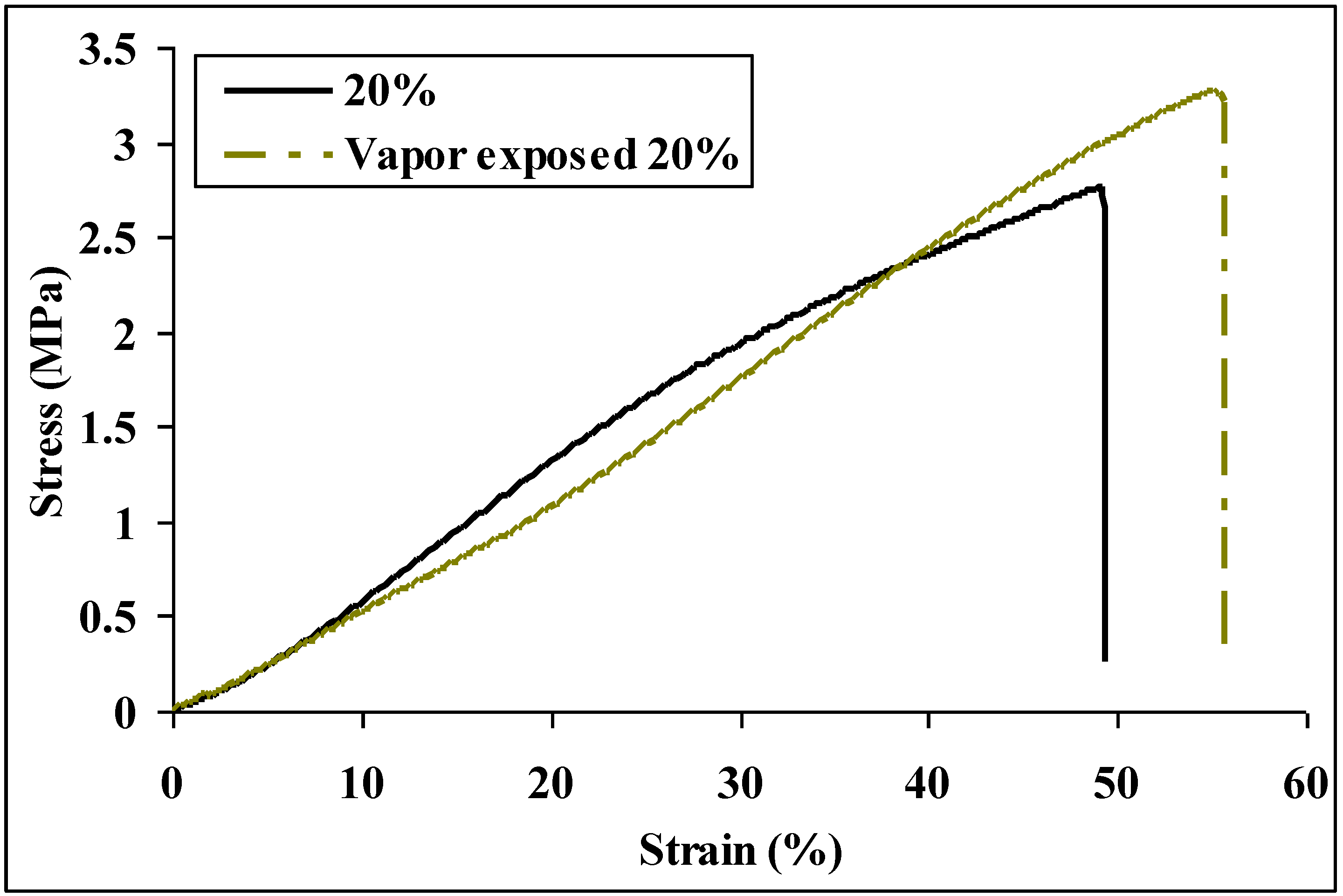 Typical stress-strain plots of nylon 6 non-woven fiber mats electrospun from 20 wt % solutions before and after formic acid vapor exposure for 30 min at room temperature.