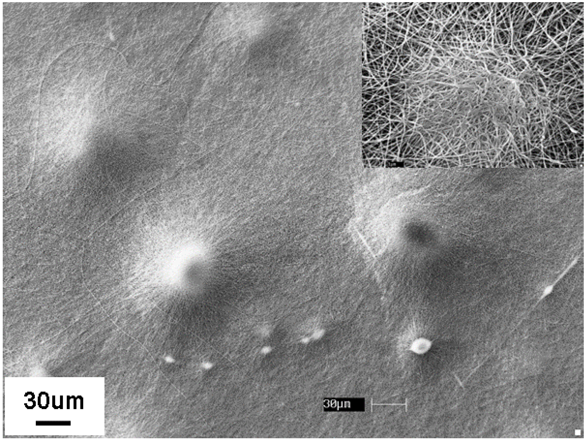 Figure 1 shows the typical stress-strain plots of nylon 6 non-woven fiber mats electrospun from 20 wt % nylon 6 in 88% formic acid solutions with and without 1 wt % (based on the weight of nylon 6) CNTs. Table 1 is the summary of the tensile properties of nylon 6 non-woven fiber mats electrospun from 20 wt % nylon 6 in 88% formic acid solutions with and without 1 wt % CNTs. Young’s modulus, tensile strength, elongation, and toughness (calculated by integrating the area under the stress-strain curves) of the nylon 6 non-woven fiber mats increased 51%, 87%, 18%, and 136%, respectively, after incorporating 1 wt % CNTs into the nylon 6 nanofibers. Therefore, the composite electrospun nylon 6/CNTs non-woven fiber mats have a higher stiffness, strength, and ductility. The enhancement in the mechanical properties might originate from the good dispersion of CNTs as well as the strong interaction between CNTs and nanofibers. Good interfacial adhesion between the CNTs and the nylon 6 nanofiber is essential for efficient load transfer in the non-woven fiber mats [16]. The improvement of the strength property by incorporating CNTs into the nanofibers was expected and consistent with the reported results in the literature. Bazbouz et al. [19] reported that the tensile strength of the nylon 6 nanofiber mats electrospun from 20 wt % containing only 1.0 wt % MWCNTs (Multiwall carbon nanotubes) was increased by 25%, compared with the nylon 6 mats. They also reported that the strain at break (elongation) of the nylon 6/MWCNTs nanofiber mats was decreased by 18%. However, the elongation of the electrospun nylon 6/SWNTs non-woven fabrics increased 18%. Jeong et al. [20] reported the elongation of electrospun polyvinyl alcohol (PVA) non-woven fabrics increased by incorporating MWNTs into composite nanofibers when the weight percentage of filler (MWNTs) was lower than 3 wt %. The reason for this is that, at a low filler wt %, the load transfer to the inner nanotubes is low, which enhances the tensile properties. The initial increase in the tensile strength and tensile modulus (i.e., for the composites containing 1 wt % and 2.5 wt % of filler) is attributed to the high degree of orientation of the filler nanotubes in the wrapped nanofibers.