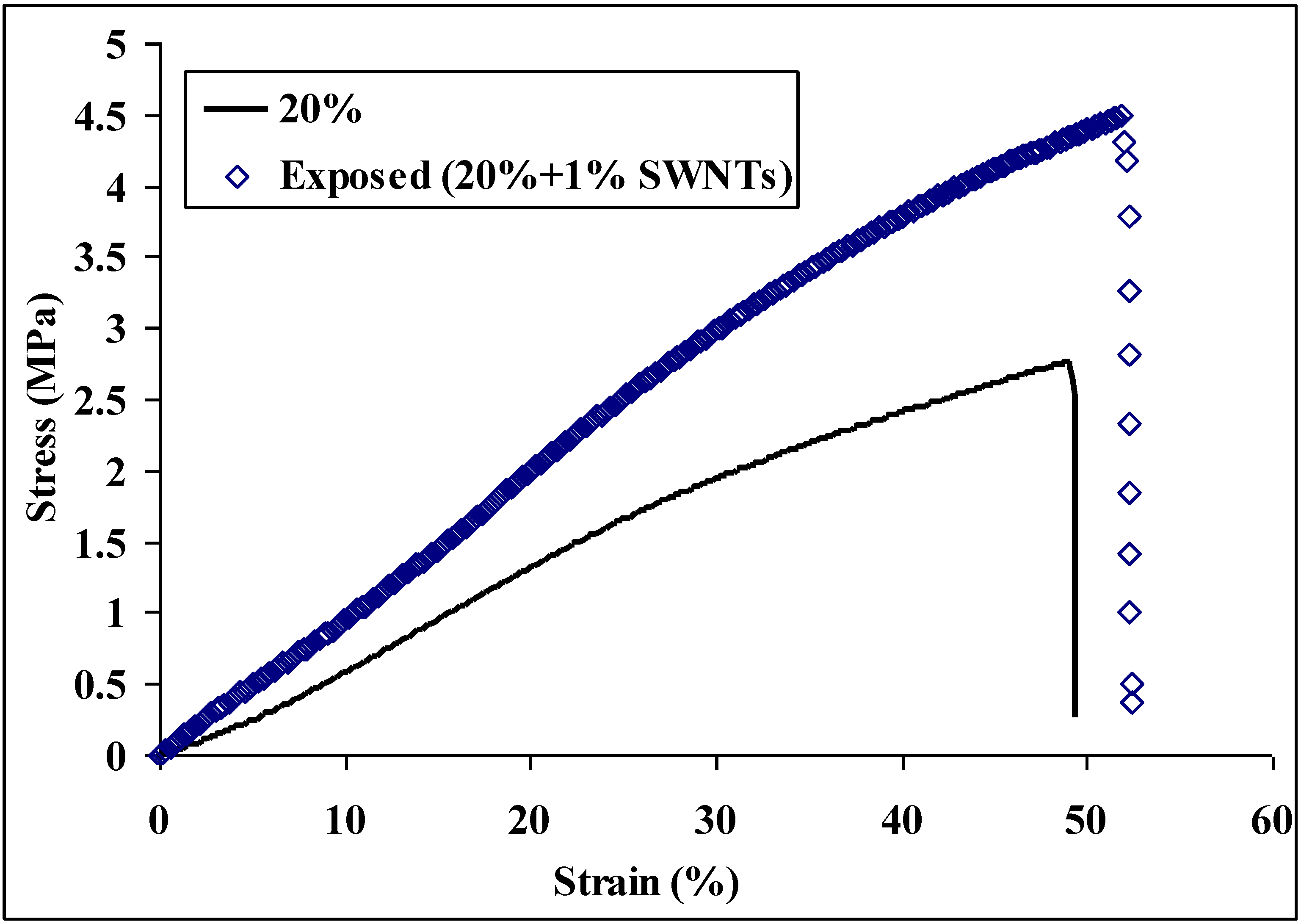 Typical stress-strain plots of nylon 6 non-woven fiber mats electrospun from 20 wt %, and 20 wt % with 1 wt % CNTs after formic acid vapor exposure for 30 min at room temperature.