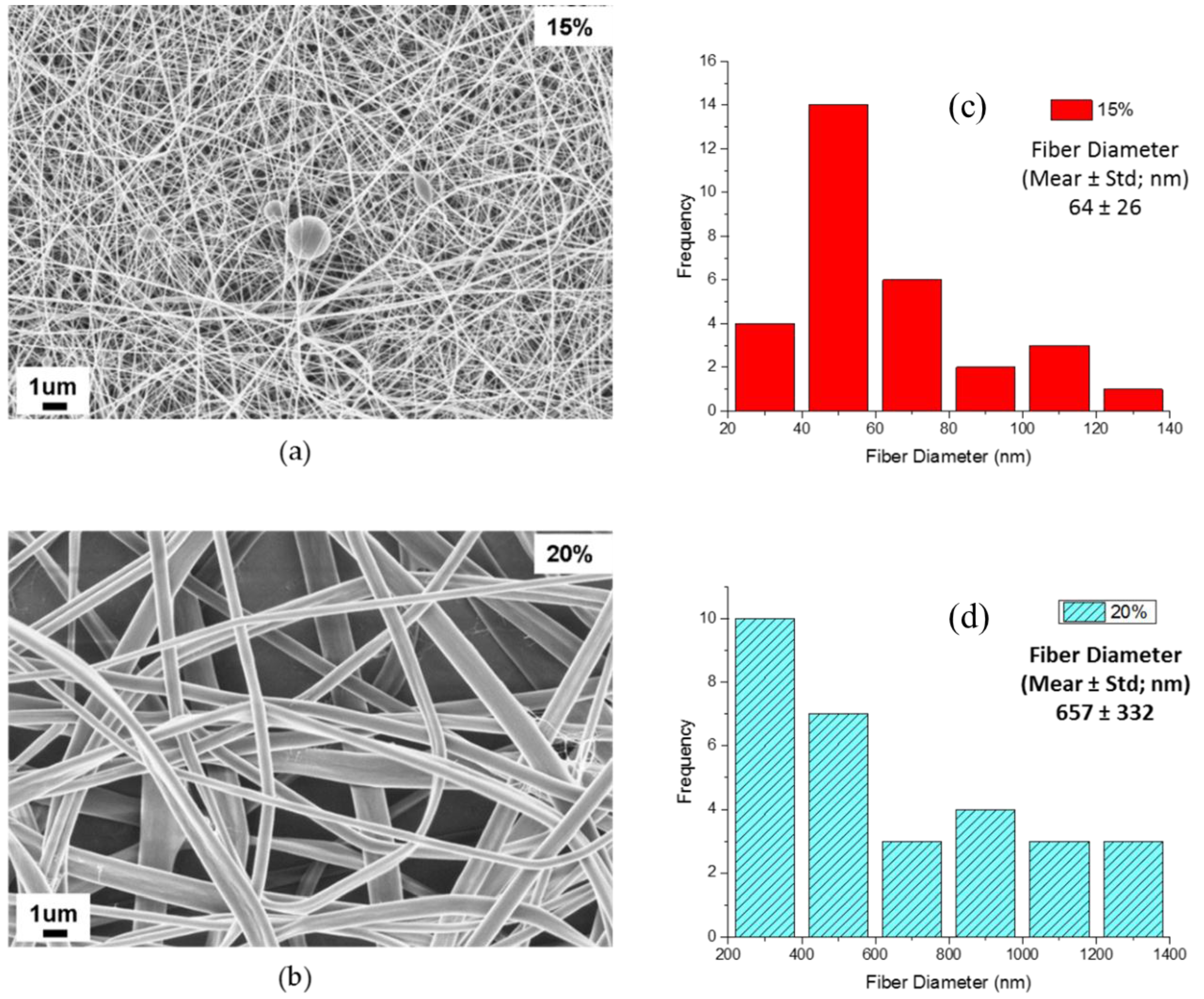 A final approach for increasing the 2-D-structured electrospun nylon 6 non-woven fiber mat’s strength was to increase the packing density of fibers by decreasing the fiber diameter. Figure 9 shows the morphology of nylon 6 fibers electrospun from 15 wt % (Figure 9a) and 20 wt % (Figure 9b) nylon 6 in 88% formic acid. Thirty measurements were conducted to analyze the average fiber diameter for using software Image J. The average diameter of nylon 6 fibers electrospun from 20 wt % and 15 wt % solutions is 657 ± 332 nm (Figure 9d) and 64 ± 26 nm (Figure 9c), respectively. Thin but beaded fibers were formed from the 15 wt % solution. The average fiber diameter of the nylon 6 nanofiber electrospun from 20 wt % solutions is much bigger than the nylon 6 fibers electrospun from a 15 wt % solution. Higher concentration of nylon 6 favored the formation of uniform fibers.