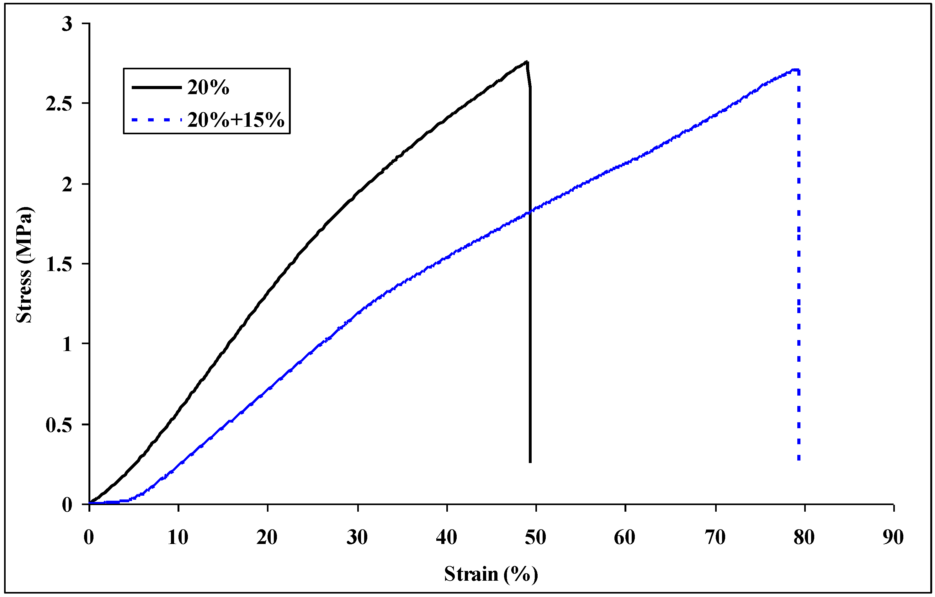 To fully realize the theoretically predicted performance improvement, a number of important factors must be manifested in the final composite [10]. For a structural point of view, the fiber spacing should be smaller than the characteristic strength-limiting flaw; thus, smaller fiber diameters are desirable in order to produce a higher packing density. Figure 10 shows the typical stress-strain plots of nylon 6 non-woven fiber mats electrospun from 20 wt % and 20 wt % + 15 wt % solutions. Young’s modulus, tensile strength, elongation, and toughness of the non-woven fiber mats are summarized in Table 5. The elongation and toughness of the nylon 6 non-woven fiber mats electrospun from 20 wt % and 15 wt % solutions increased 39% and 75%, respectively, compared to the non-woven fiber mats electrospun from 20 wt %. The smaller size diameter of the nylon 6 nanofibers electrospun from 15 wt % solutions caused a higher packing density and hence improved the ductility of the electrospun nylon 6 non-woven fiber mats. Papkov et al. [13] has demonstrated improvements in modulus and strength of individual electrospun polymer nanofibers with a reduction in their fiber diameter. This size effect of nanofiber diameter to the mechanical properties has also been proved in this study. The non-woven fiber mats electrospun from 20 wt % and 15 wt % of solutions showed higher mechanical properties than those from 20 wt % solutions.