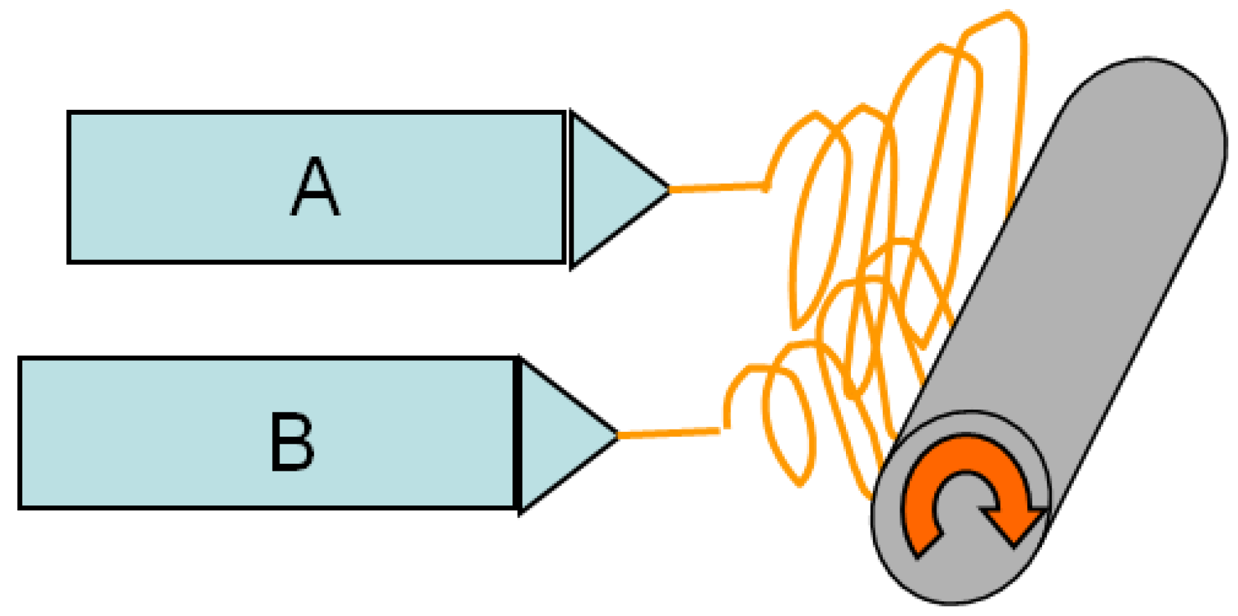 Table 6 shows the concentrations of the nylon 6 solutions used for the parallel electrospinning (Figure 11). For the non-woven fiber mats electrospun from 20 wt % and 15 wt %, 20 wt % and 10 wt %, 15 wt % and 10 wt % solutions, the syringes A and B shown in Figure 11 were switched at the halfway point of the 3-h electrospinning.