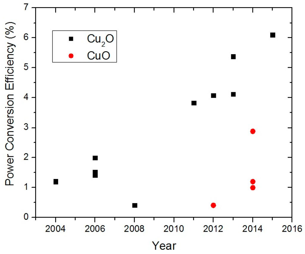 When oxidized, copper can form three types of oxides, namely: cuprous oxide (Cu2O, cuprite), cupric oxide (CuO, tenorite) and Cu4O3 (paramelaconite) [1]. All three forms of copper oxides are semiconductors, and Cu2O, in particular, is one of the first semiconductors studied for device applications. In the early 20th century, Cu2O Schottky junctions were intensively investigated for use as rectifiers in radio receivers [2]. A review of the research conducted during this period, including the difficulty of n-type doping, was written by Brattain in 1950 [3]. After the invention of the point contact transistor in 1947 and the metal oxide semiconductor field-effect transistor in 1960, interest in Cu2O declined because of the availability of single crystal silicon and germanium, which can be doped n- and p-type [2]. During the 1970s, there was a resurgence of interest in Cu2O as a semiconductor for photovoltaics (PV) because of the need to develop terrestrial PV devices for solar energy conversion in response to the first oil crisis of 1973. The Cu2O solar cells investigated during this period were Schottky junction PV devices [4,5,6]. Two research projects on these devices supported by the U.S. National Science Foundation were carried out at the Joint Center for Graduate Study [5,6]. This focus on the Schottky junction structure was due to the difficulty of forming p-n homojunctions in Cu2O. Owing to chemical reduction of the Cu2O surface to Cu during sputter deposition, the best η obtained was only of the order of 1% regardless of the metal deposited [6]. Nevertheless, it was recognized that a heterojunction or metal-inuslator-semiconductor structure should improve the performance of Cu2O PV devices. The low η that could be achieved in these Cu2O PV devices eventually led to another waning of interest by the 1980s. A review of the literature on Cu2O Schottky junction devices during this period can be found in [7]. Despite this, research on Cu2O PV devices continued in Japan, Italy and elsewhere after the 1990s. The Cu2O PV research in this recent period is concerned with a search for newer dopants for Cu2O, suitable transparent n-type semiconductors for heterojunction formation and low damage junction formation techniques. As a result, there has been significant improvements in the reported η of Cu2O PV devices. This can be seen from Figure 1, which is based on a compilation of published η values in the PV literature [8]. In 2015, an η value of 6% was reported for a heterojunction PV device based on Cu2O and another n-type semiconductor. This value is exactly triple that of the best η value reported in 2006 for a Cu2O heterojunction PV device (see Section 3). Figure 1 shows that, in addition to Cu2O, there has been growing research interest in CuO PV devices in recent years. The highest reported η as of 2015 for a CuO based PV device is 1.2%.