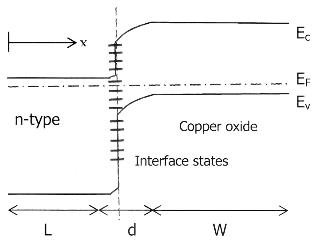 Schematic energy band diagram for heterojunction solar cell of copper oxide and an n-type semiconductor. Interface states are represented by - .