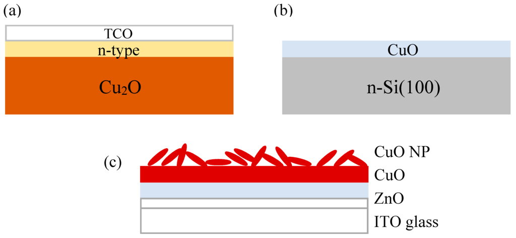 Schematic device structure for (a) Cu2O/ZnO heterojunction solar cell; (b) CuO/n-Si heterojunction solar cell; and (c) CuO/ZnO heterojunction solar cell enhanced by mixed phase CuO/Cu2O nanopowder.