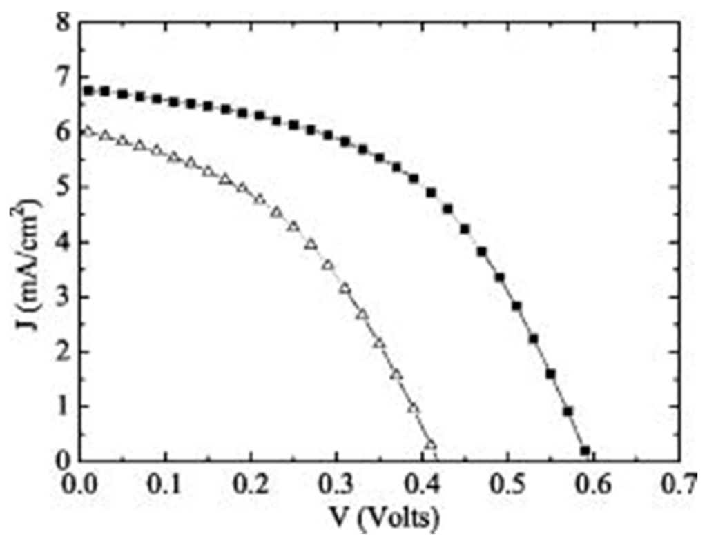 In recent years, the photovoltaic behavior of CuO/fullerene (C60) heterojunctions has also been investigated. This inorganic-organic heterojunction structure is motivated by the fact that CuO is a p-type material while fullerene is an n-type (acceptor) material used for both heterojunction and bulk heterojunction organic solar cells. Oku et al. used electrochemical deposition to deposit CuO onto ITO working electrode by using an aqueous electrolyte consisting of CuSO4 and 1-lactic acid at 65 °C [49]. The C60 powder and top Al electrode were deposited on to CuO by vacuum evaporation. The measured η of the device, however, was extremely low (~10−4%) due to low Voc, FF and Jsc.