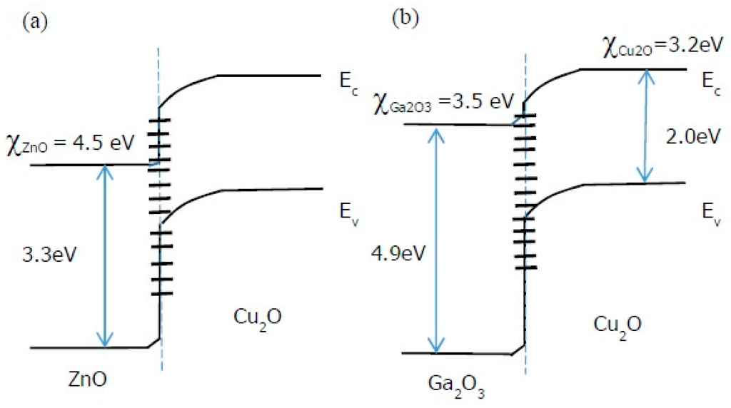 Schematic energy band diagram of (a) ZnO/Cu2O and (b) Ga2O3/Cu2O heterojunction showing difference in conduction band offset. Interface states are represented by - .