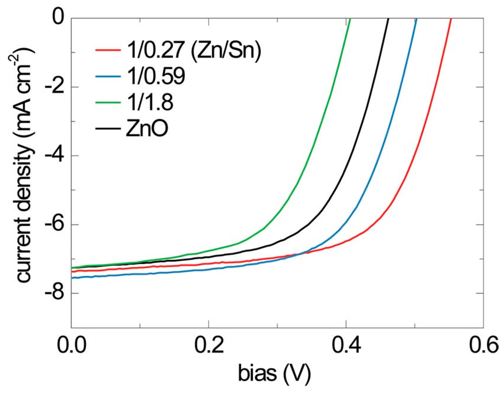 The second concerns the use of atomic layer deposition (ALD) to control the interface quality of Cu2O heterojunction soloar cells. In a study by Lee et al. [35], an ultra thin buffer layer of amorphous zinc tin oxide (a-ZTO) was deposited by ALD onto electrochemically deposited Cu2O. a-ZTO reduces recombination at the interface by acting as an electron blocking layer. The J-V characteristics for three ZnO:Al/a-ZTS/Cu2O/Au devices with different Zn:Sn cationic ratios in a-ZTS is shown in Figure 6. At optimized composition of a-ZTO, an η of 2.65% was measured for these devices which is higher than the control device without a-ZTO. In a subsequent study [36], it was further demonstrated that the ALD reaction conditions can be used to control the oxidation state of Cu and prevent the formation of an undesirable CuO interfacial layer. When the ALD temperature of the a-ZTO layer was decreased, the Voc of ZnO:Al/a-ZTS/Cu2O/Au devices increased, indicating reduced defects at the a-ZTS/Cu2O interface. The highest η of 3.06% was observed at a deposition temperature of 70 °C. This group also demonstrated that insertion of 20 nm thick extrinsic Cu2O:N between the Cu2O and Au layers can effectively reduce contact resistance of this device structure and improve FF. This is because Cu2O:N acts as a p-type transport layer and facilitates hole transport by tunneling [37]. It should be noted that Cu2O films have also been used as hole transport layers in perovskite solar cells [38].