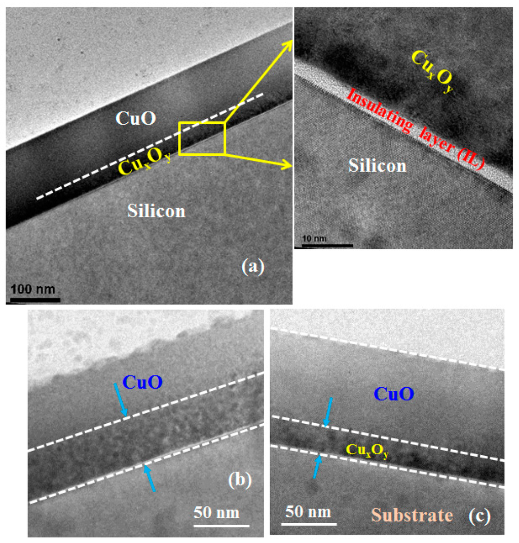 Cross-sectional TEM of p-CuO/n-Si heterostructure. Sputter deposited CuO at 150 W on n-Si substrate for (a) as-deposited; and (b) after thermal treatment at 300 °C for 1 min; (c) CuO deposited at 50 W sputtering power and annealed at 300 °C for 1 min.