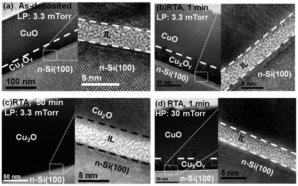 HRTEM image of p-CuO/n-Si hetreojunction. p-CuO was deposited on n-Si using different radio frequency power of 50 W, 100 W, 150 W and by using two-step sputter. There is significant impact of radio frequency power on the material quality and interface properties. Reprinted with permission from Journal of Applied Physics 116, 074501 (2014) Copyright 2014, AIP Publishing LLC [42].