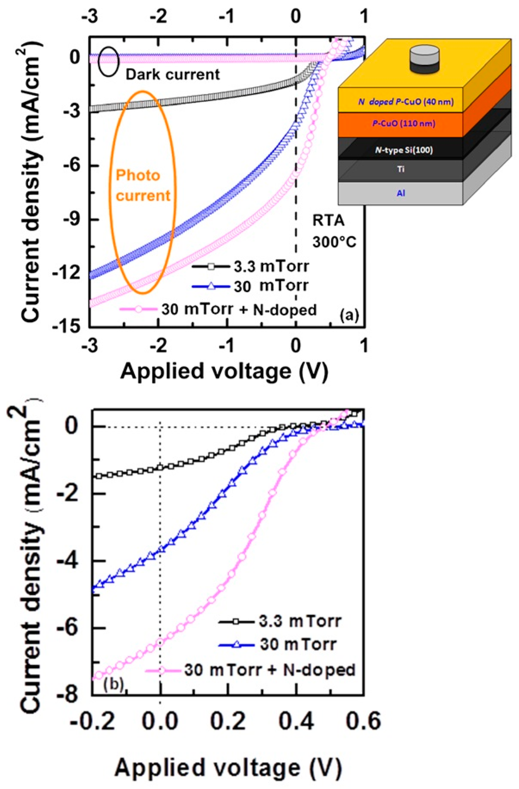 (a) Comparison of dark current and photocurrent densities of p-CuO/n-Si heterojunction solar cells with CuO deposited at 3.3 and 30 mTorr working pressures. The open circuit voltage and photocurrent increased significantly for the sample deposited under high working pressure. Inset of the figure shows schematic diagram of nitrogen-doped CuO device; (b) Variation of open circuit voltage and short circuit current of the solar cells © 2014 John Wiley & Sons, Ltd. [41].