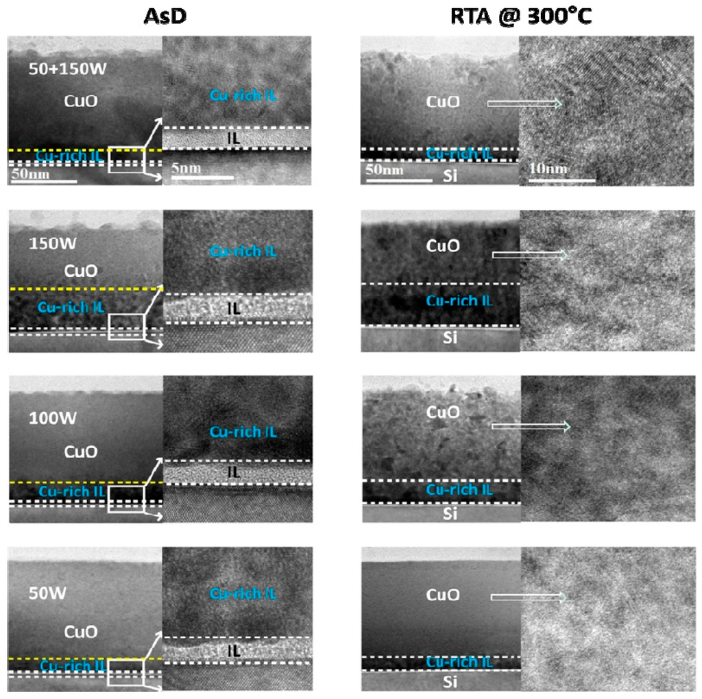 Another early study of the CuO/Si heterojunction is that by Kumar et al. [40]. These investigators used the RF argon sputtering of a CuO target to deposit CuO onto n-Si(100). After deposition, the polycrystalline CuO films were annealed in nitrogen at 300 °C. The crystalline structure of the film was determined by X-ray diffraction to be predominantly CuO phase for an annealing temperature of 300 °C [40]. Under dark conditions, the CuO/Si heterojunction showed a rectifying J-V characteristic with a rectification ratio of 104 (at +3 V and −3 V) [40]. When illuminated, a photovoltage response was observed [40]. It is also worth noting that there is a presence of interfacial oxide layer between the silicon substrate and p-CuO layer. High resolution transmission electron microscope (HRTEM) analysis reveals that the thickness of the interfacial layer is around 4 nm. Furthermore, a Cu-rich interfacial layer between p-CuO and silicon substrate is also observed and the Cu-rich interface layer significantly depends on the sputtering power, as shown in Figure 7.