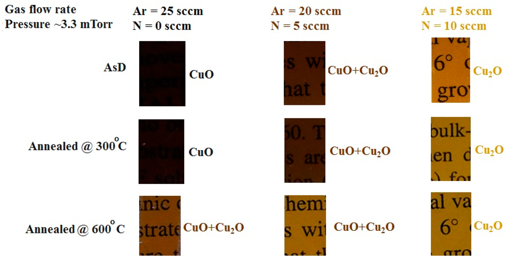 The reflectance and transmittance of N-doped CuO thin films in the wavelength range of 200 nm–1500 nm was found to be increased with increasing nitrogen concentration. It was explained by Masudy-Panah in terms of CuO bandgap widening and the presence of Cu2O phase. It was also shown that by tuning the nitrogen concentration during sputter growth of CuO film (in situ nitrogen doped), the color of the copper oxide film can be tuned for as-deposited and also for the annealed films as shown in Figure 12.