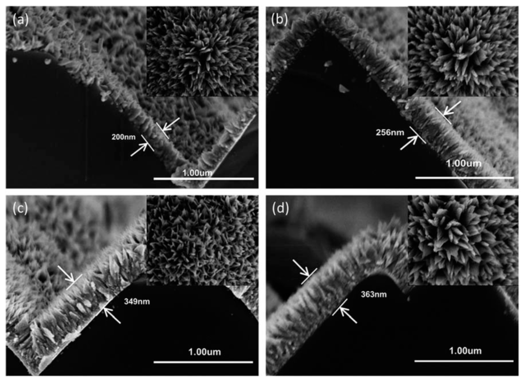 Cross-sectional field emission scanning electron microscope image of CuO NL grown on pyramid-textured Si substrates for (a) 30 min; (b) 45 min; (c) 60 min; and (d) 90 min in a two-step process. Inset of each image shows the corresponding top view. Reproduced in part from J, Mater. Chem. A, 2014, 2, 6796 with permission from The Royal Society of Chemistry [47].