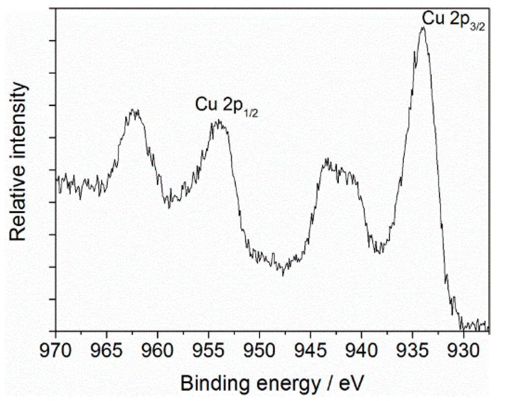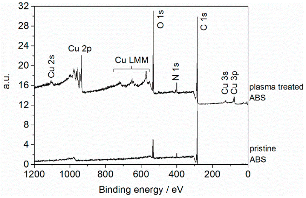 Figure 1 shows that the surface of pristine ABS is composed of carbon (C 1s at 285 eV), nitrogen (N 1s at 399 eV), and oxygen (O 1s at 532 eV). According to its chemical structure, ABS is an oxygen-free polymer, but the presence of surface-near oxygen has been reported frequently and may be related to additives used for the fabrication of this copolymer and to contaminations from ambient air (e.g., adsorbed water) [26,27,28]. However, XPS results reveal changes in the survey spectrum of ABS upon exposure to air plasma. New emission lines have been identified that are attributed to copper. The nature of the Cu in the films can be further analyzed from the Cu 2p region of the X-ray photoelectron (XP) spectrum. The corresponding core level Cu 2p spectrum (representative for all of the surfaces studied) in the 930–970 eV region is shown in Figure 2.