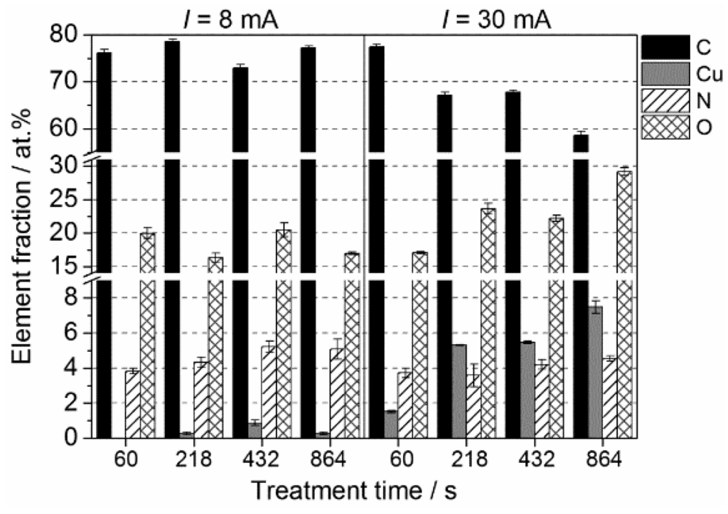X-ray photoelectron spectroscopy (XPS) results: Atomic concentration (at. %) of carbon (C); copper (Cu); nitrogen (N); and oxygen (O) depending on treatment time and applied input current. Results are presented as averaged value from three measurements for each specimen. (Operating parameter: Qair = 4 slm).