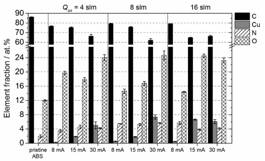 A comparison of the elemental composition of plasma treated ABS specimens at various input currents and air flow rates analyzed by XPS is depicted in Figure 4. After plasma treatment, the relative surface composition was altered significantly. Compared with pristine ABS, a notable reduction in carbon content is accompanied by a remarkable increase of copper and oxygen concentrations for all tested surfaces. Furthermore, an increase of the nitrogen concentration from initially 2 at. % up to 5.7 at. % was measured. Among the parameters investigated, the input current is the most influential on the elemental surface composition. The relative surface concentration of Cu was found to increase with higher operating current from 0.4 at. % for 8 mA up to 7.5 at. % Cu at 30 mA. A possible explanation for the present result is the energy provided to the plasma changes with increasing input current. Previous characterizations of the plasma reveal that the gas production rate was enhanced with rising input currents [34]. Consequently, since Cu species were provided into the plasma by sputtering of the electrode, it is most likely that, for high input currents, electron collision processes are becoming important, which influence the generation of reactive plasma species that favor the deposition of copper. In terms of the air flow rate, the results show that this process parameter only marginally effects the elemental composition when operating at 30 mA.