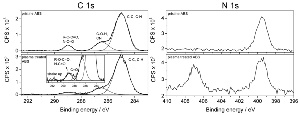 Plasma-induced surface modification of ABS was investigated by XPS analysis. Representative survey spectra of pristine ABS and ABS exposed to air plasma are shown in Figure 1.