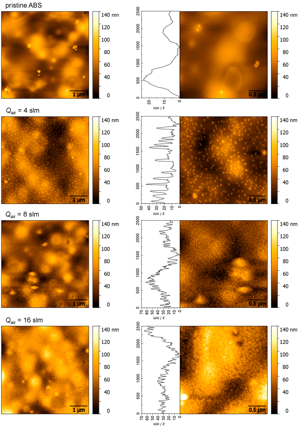 Atomic force microscopy (AFM) images (5 µm × 5 µm and 2.5 µm × 2.5 µm) and height profiles of pristine ABS and of ABS after plasma treatment for different air flow rates (operating parameters: I = 30 mA, t = 432 s).
