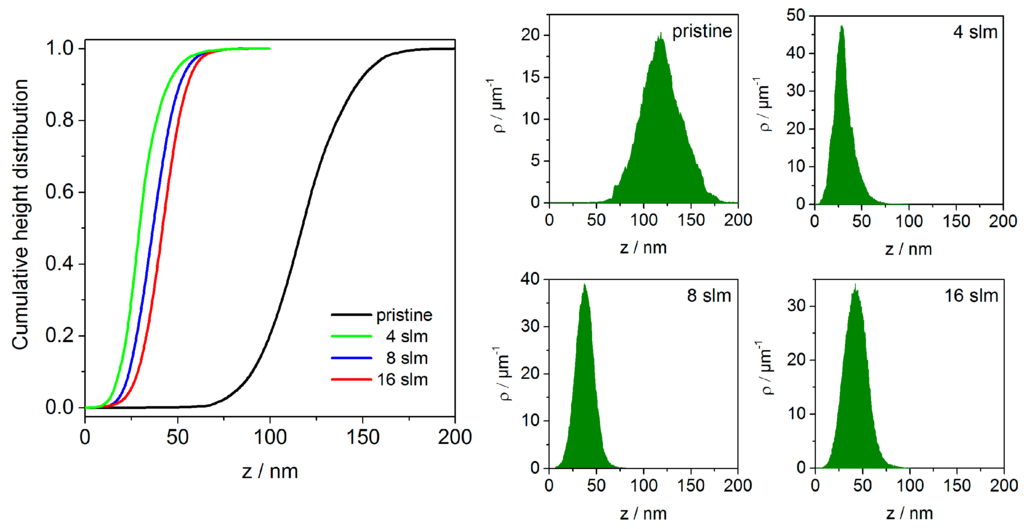 In order to estimate the particle size more precisely, histograms (statistical distribution of z-values) of AFM images presented in Figure 6 are investigated. For ease of comparison, the measured height distributions are also plotted as cumulative distribution, which is the integral of the density. As can be seen in Figure 7, the average height of non-treated ABS was approximately 118 nm with values ranging between 60 and 180 nm. These values correspond to the hilly landscape of the ABS substrate as well as to the presence of dust particles that originate from sample handling in ambient air. Therefore, processed data of plasma treated substrates presented in Figure 7 are obtained from flattened images. Hence, comparing the histograms of plasma treated surfaces depending on the air flow rates, a maximum height of 28, 37, and 42 nm for 4, 8, and 16 slm, respectively, was determined. The slight but significant change to higher z values with increasing flow rate indicates some agglomeration of round-shaped copper nanoparticles.