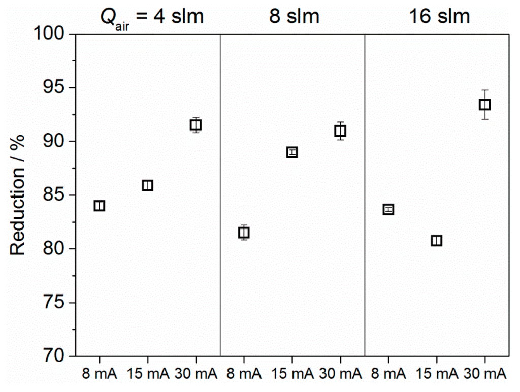 Effect of air flow rate and input current on the inactivation of Staphylococcus aureus, which is presented in percentage reduction. Values are the average of triplicate. The number of colony forming units on pristine ABS was N0 = 1 × 107, and the detection limit was 99.9999%.