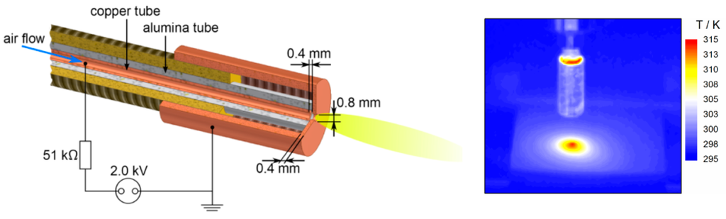 (Left) Schematic design of the micro hollow discharge geometry of the DC plasma jet; (Right) Surface temperature of ABS during plasma treatment.