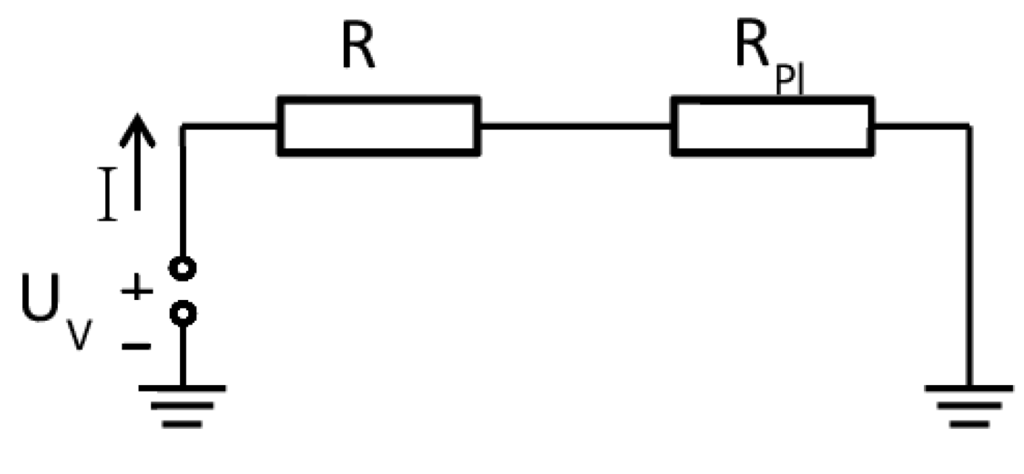 Plasma is generated in the gap between the inner and outer electrode when a negative voltage of 2 ± 0.2 kV from a DC high voltage power supply (PS FX06R50, Glassman High Voltage Inc., High Bridge, NJ, USA) is applied. A resistor of 50 kΩ connected in series limits the current (see Figure 10). For the experiments, the current was adjusted to 30 mA. Voltage across the 50 kΩ resistor was monitored with a high voltage probe (P5100A, Tektronix, Beaverton, OR, USA). From current and voltage drop across the resistor, the power dissipated in the plasma is determined to be about 15 W. Compressed air was used as operating gas flowing through the inner copper tube electrode. The gas flow rate was controlled by a mass flow controller (MF1C01324CMAV0, MKS Instruments, Andover, MA, USA) and a four-channel mass flow and pressure display unit (647C-4-R-1-N, MKS Instruments). With a gas flow of 8 slm, the plasma is expelled from the 0.8 mm orifice in the cap generating an afterglow plasma plume of 5–10 mm. The temperature of the plasma between the electrodes is about 1500 K, which is the approximated value for the gas temperature in a micro hollow cathode discharge in air at atmospheric pressure [46]. However, due to the air flow, the plasma plume temperature at 10 mm distance in axial direction from the orifice is already close to room temperature. This gas temperature of the expelled plume was measured with an optical interference thermos-sensor (UMI 4, FISO Technologies, Quebec, QC, Canada). For the experiments, the plasma jet device was fixed along the z-axis of a stepper motor controlled xyz-stage (FF500/CNC, Proxxon GmbH, Föhren, Germany) at a distance of 10 mm to the ABS samples. For a uniform exposure, the jet was moving in a meandering way, covering an area of 20 mm × 20 mm (with the sample sitting in the middle) across the sample twice. The second meandering route was perpendicular to the first. To vary treatment times, the stepper-motor speed and the distance between the passes of the meander can be changed.