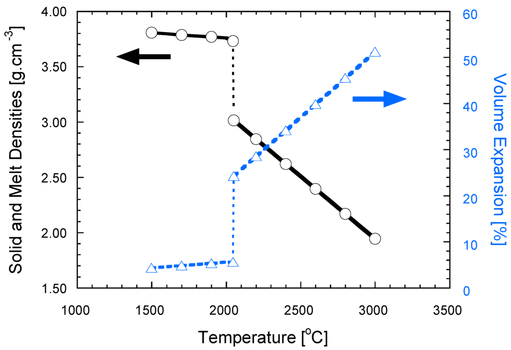 - Kirshenbaum, A.D.; Cahill, J.A. The density of liquid aluminum oxide. J. Inorg. Nucl. Chem. 1960, 14, 283–287. [Google Scholar] [CrossRef]