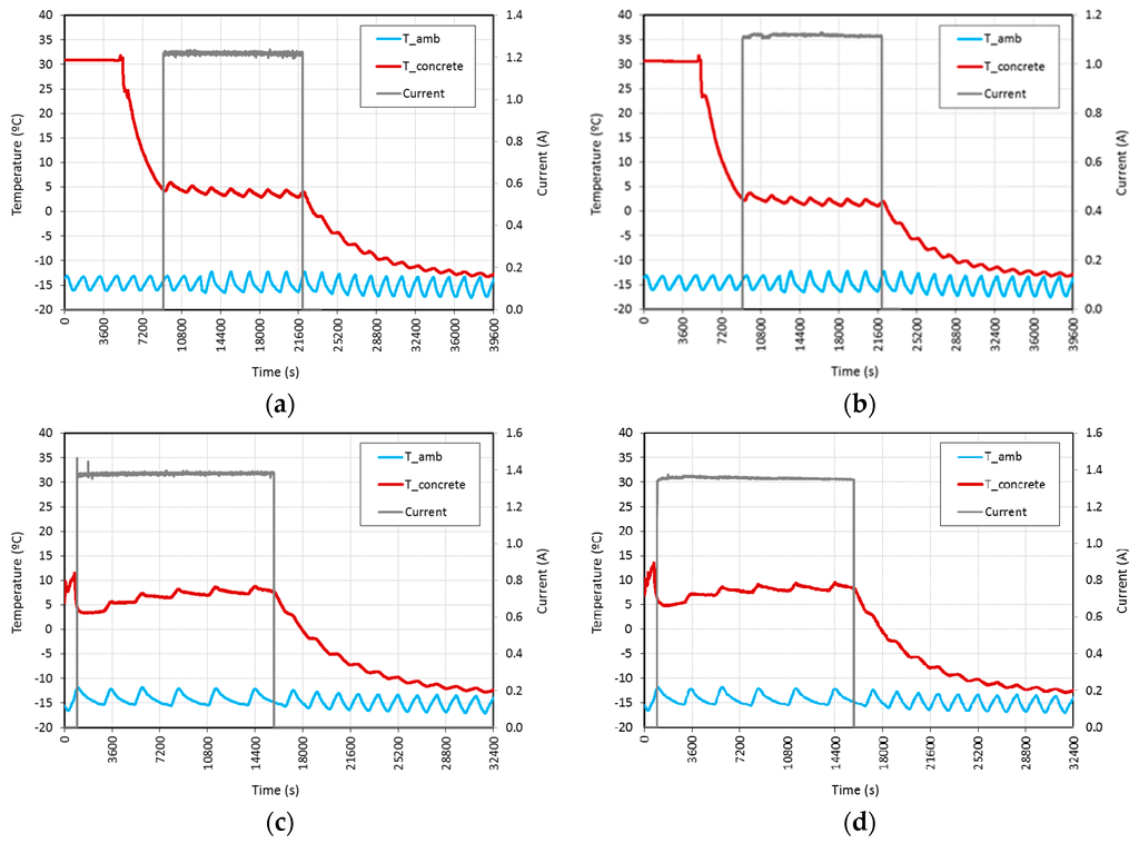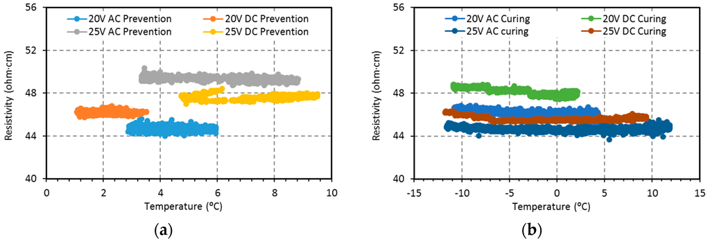 - Fixed voltages of 20 V or 25 V allowed specimens both to prevent freezing and to increase their temperature above 0 °C in an initial environment of −15 °C curing process. Consequently, a fixed voltage of 20 V could be enough to make the specimen work as a heating element with a very reasonable amount of energy consumption.