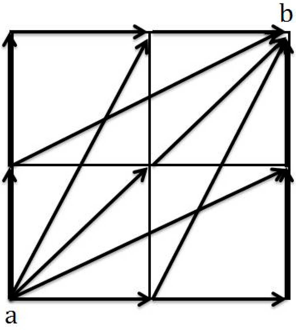 Figure 3. Illustration of several prospective travel paths of waves that propagate from node “a” to “b”.