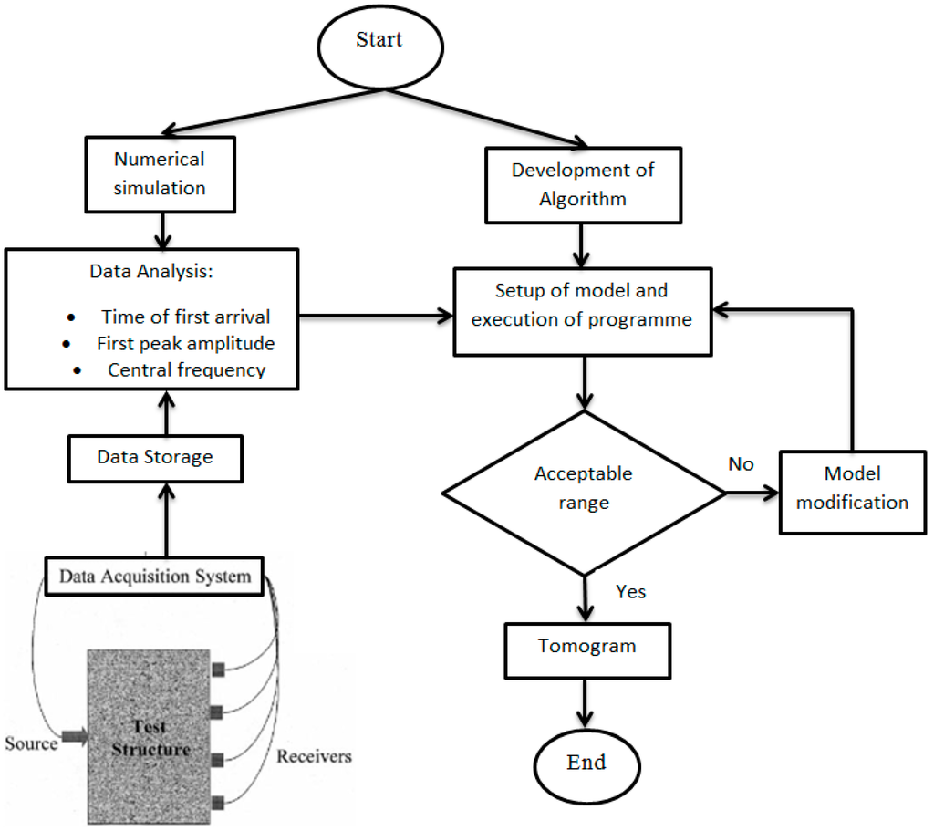 In this study, a computer algorithm was developed to process large amount of elastic wave data for the purpose of tomography reconstruction. Figure 1 shows the standard procedures. The aim was to plot each element of a discretized cell of measurement with the specific elastic wave parameters (e.g., velocity) and to see which magnitude would change according to the local variation of the concrete acoustic properties.