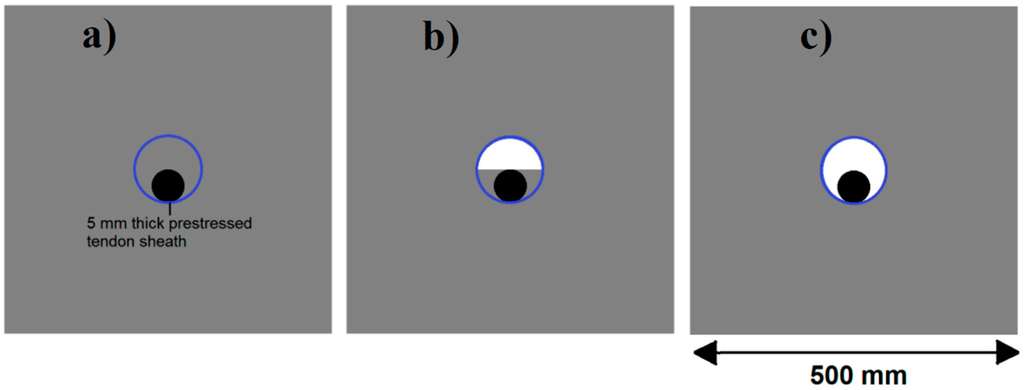 Figure 6. Schematic diagrams of simulated pre-stressed concrete with steel tendon models showing (a) 100%; (b) 50% filling grout tendon and (c) 0% grout filling inside the tendon duct.