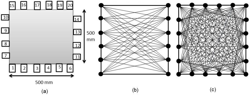 Figure 7. (a) Arrangement of sensors on 500 mm × 500 mm concrete model; (b) ray-path coverage with 2-side sensor array; (c) ray-path coverage with 4-side sensor array (complete coverage).