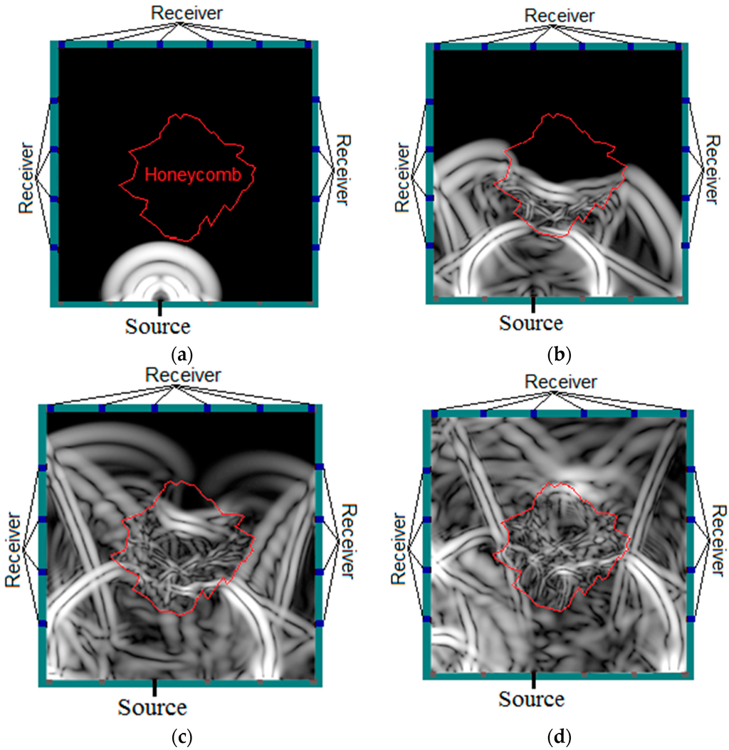 Figure 8. Four consecutive snapshots of the simulated transient displacement field in the model with honeycomb: (a) Wave starts to propagate from a trigger; (b) Wave experiences distortion by honeycomb; (c) Wave propagated faster in normal medium than in honeycomb; (d) Wave-front arriving at the side and being received.